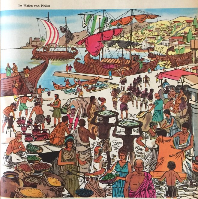 Griechische, ägyptische, persische und arabische Worte schallten über den Kai von Piräus. Lastträger schleppten schwere Ballen, pralle Säcke und große Tongefäße von den ankommenden Schiffen auf den Kai. Einige Säcke und Ballen ließen die Fernhändler in das Deigma, eine große Halle bringen. Hier wurden sie geöffnet. Um diese Waren drängten sich Athener Händler. Sie suchten hier die Waren aus, die sie brauchten und prüften sie genau. Dann trieben sie ihre mit Getreide, anderen landwirtschaftlichen Produkten, Salz und Elfenbein oder auch mit kostbaren Teppichen beladenen Esel auf den Markt von Athen.