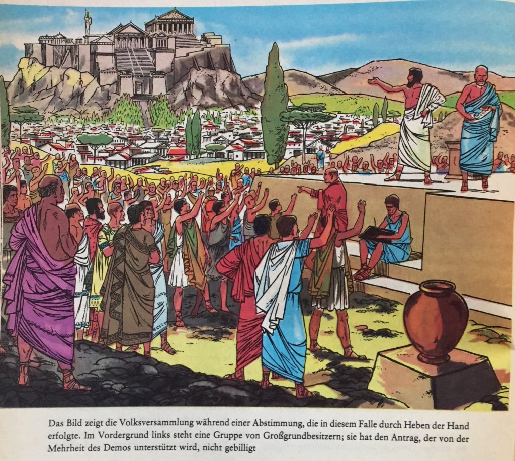Die größte Gewalt im athenischen Staat hatte die Volksversammlung. An ihr konnte jeder freie Bürger vom 20. Lebensjahr an teilnehmen. Die Volksversammlung wählte die wichtigsten Beamten in offener Abstimmung durch Handerheben.