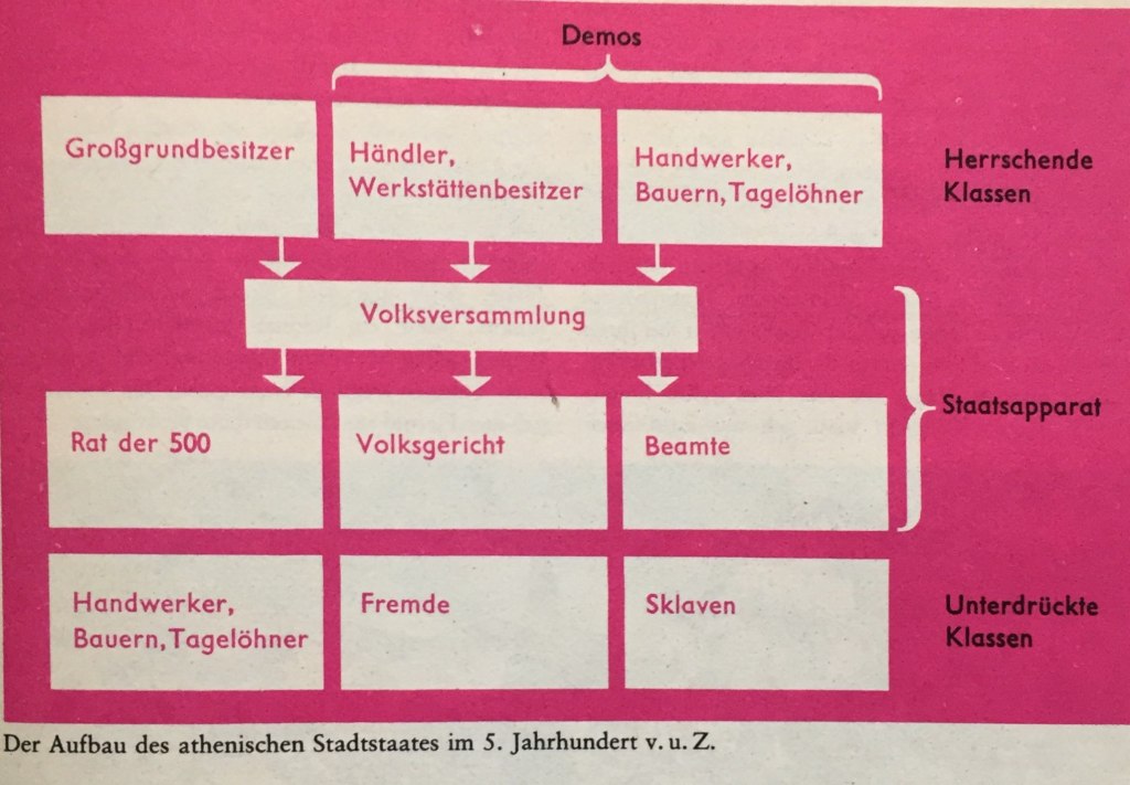 Der Staat in Athen war eine Demokratie für die Sklavenhalter. In der Sklavenhalterdemokratie war der größte Teil der Athener Bevölkerung von der Mitbestimmung ausgeschlossen.