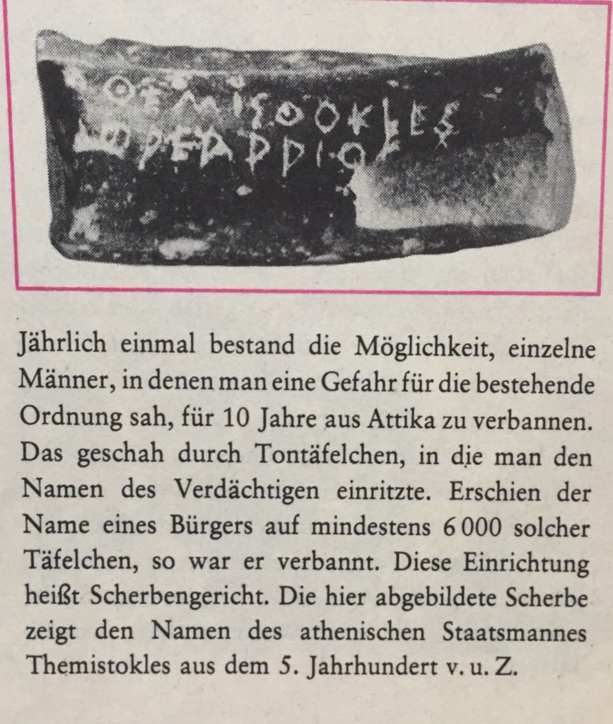 Andere Ämter(Ratsmitglieder, Richter)wurden verlost. Das geschah, indem man in ein Gefäß weiße und farbige Bohnen tat, in ein zweites Täfelchen mit den Namen der Bewerber. Dann wurden gleichzeitig eine Bohne und ein Täfelchen herausgenommen. Wessen Täfelchen zusammen mit einer weißen Bohne herauskam, der galt als gewählt.