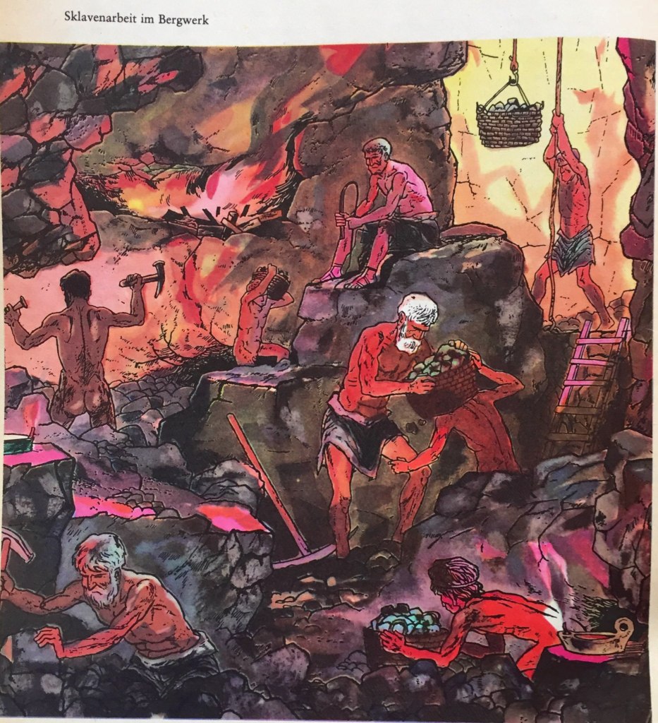 Am schwersten war die Lage der Sklaven in den Bergwerken und Steinbrüchen. Tausende arbeiteten in den Silbergruben von Laurion. Über hundert Meter unter der Erde brachen sie enge Gänge in das Gestein. Ihre Werkzeuge waren eiserne Brechstangen und schwere Hämmer. Mit ihnen mussten sie gebückt oder gar halb liegend hantieren. Halbwüchsige Sklaven zogen mit dem kostbaren Silbererz gefüllte schwere Körbe durch die stickigen Gänge bis an den Hauptschacht. Mit einem Flaschenzug wurde das Erz ans Tageslicht gebracht. Über allem wachten die Aufseher. Sie bestraften eine Atempause und jede Unachtsamkeit hart. Schwerste Arbeit, grausame Behandlung und berstendes Gestein führten dazu, dass das Leben der Bergwerkssklaven nur kurz war.