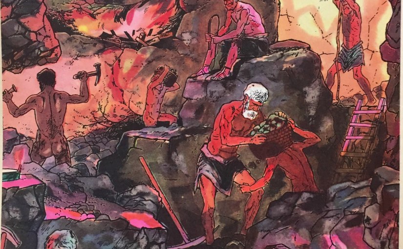 Am schwersten war die Lage der Sklaven in den Bergwerken und Steinbrüchen. Tausende arbeiteten in den Silbergruben von Laurion. Über hundert Meter unter der Erde brachen sie enge Gänge in das Gestein. Ihre Werkzeuge waren eiserne Brechstangen und schwere Hämmer. Mit ihnen mussten sie gebückt oder gar halb liegend hantieren. Halbwüchsige Sklaven zogen mit dem kostbaren Silbererz gefüllte schwere Körbe durch die stickigen Gänge bis an den Hauptschacht. Mit einem Flaschenzug wurde das Erz ans Tageslicht gebracht. Über allem wachten die Aufseher. Sie bestraften eine Atempause und jede Unachtsamkeit hart. Schwerste Arbeit, grausame Behandlung und berstendes Gestein führten dazu, dass das Leben der Bergwerkssklaven nur kurz war.