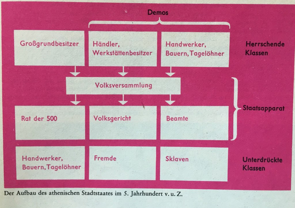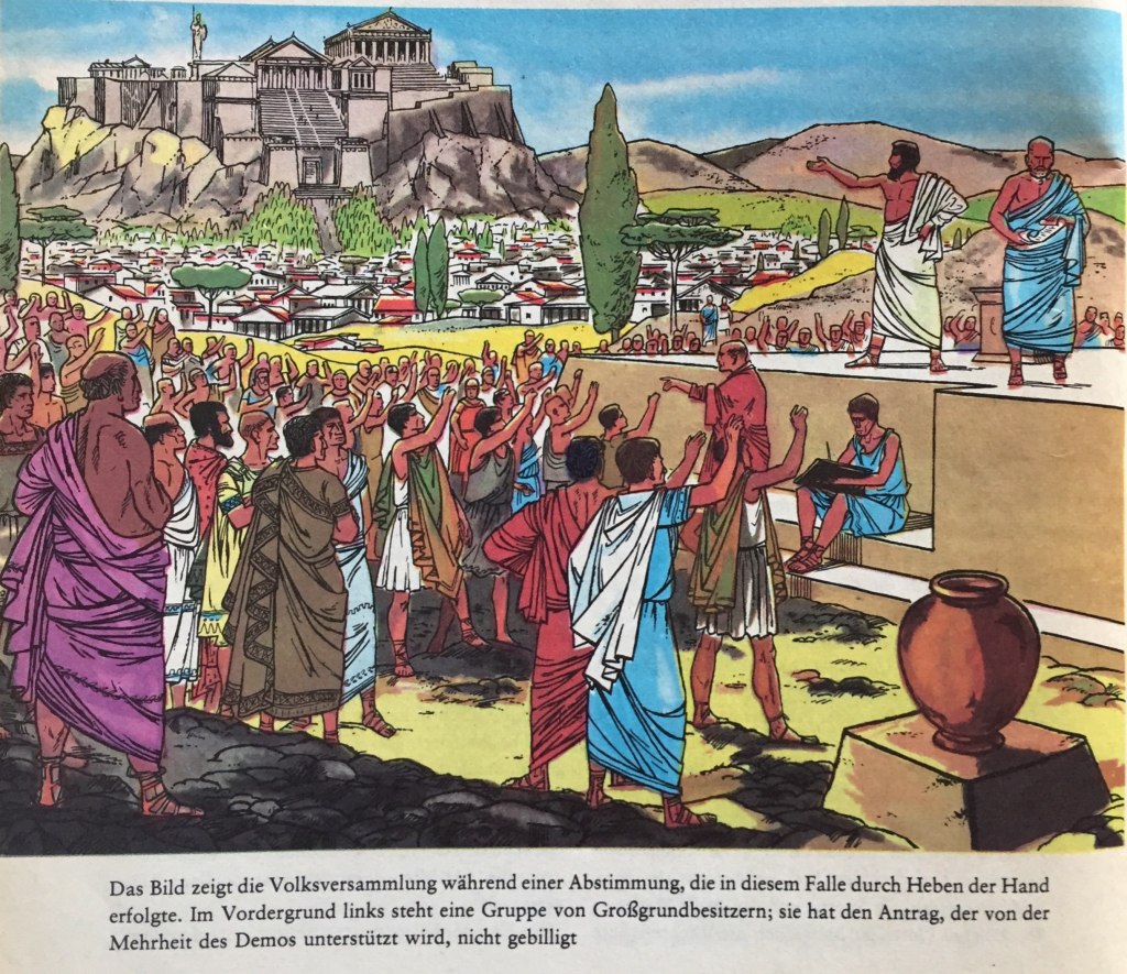 Irgendwie kommt uns das bekannt vor. Darum wird uns erzählt, dass das alte Griechenland die Wiege der Demokratie sei.  Geschäftsleute wollen ihre Interessen durchsetzen, in der Politik sind in der Regel Leute vom Mittelstand an aufwärts vertreten. „Kleine Leute“, wie z.B. Arbeiter nur in Ausnahmefällen, denn sie haben in der Regel nicht die Zeit und die Energie für das politische Geschäft, denn sie sind ja nicht gleich Berufspolitiker. Eine Kandidatur für das Parlament muss neben dem Beruf erfolgen. Stadtratsarbeit ist ohnehin ehrenamtlich. Heute agieren in den Parlamenten Lobbyisten. So werden die Interessen der herrschenden Klassen durchgesetzt.