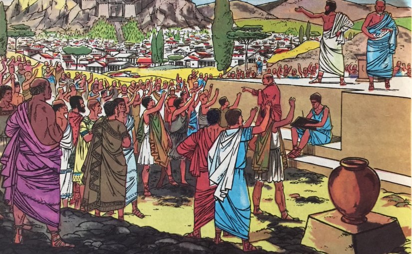Die Bürger Athens waren auf dem Wege zur Volksversammlung. Würdevoll schritten reiche Kaufherren, Besitzer von Werkstätten, Großgrundbesitzer dahin. Selten grüßten sie Vorübereilende in schlichter Kleidung. Heute waren viele Handwerker, Händler, auch Tagelöhner unterwegs zum felsigen Hügel im Westen der Stadt. Seit vier Tagen konnte jeder das Programm der Volksversammlung erfahren, das Tafeln auf dem Markt verkündeten. Ein Punkt bewegte die Gemüter der Athener Bürger besonders.