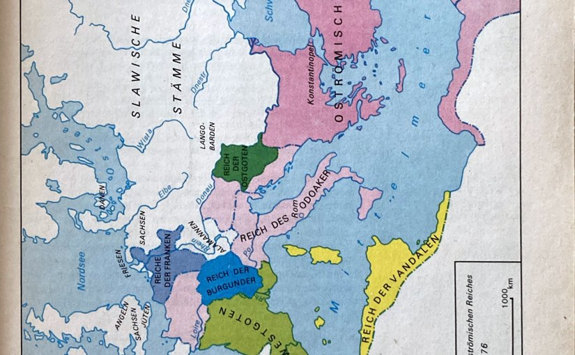 Im 5. Jahrhundert bildeten sich auf dem Boden des Weströmischen Reiches verschiedene Königreiche. In zahlreichen Kriegen und Aufständen brach das morsch gewordene Weströmische Reich zusammen. Es bestand in der Mitte des 5. Jahrhunderts nur noch aus Italien und einigen Gebieten in Gallien, im Alpenland und in Dalmatien. Im Jahre 476 sah der Befehlshaber der germanischen Söldner in Italien, Odoaker, keinen Grund mehr, den zerrütteten weströmischen Staat weiter zu unterstützen. Weil man seine Forderung nach Siedlungsland in Italien verweigerte, setzte er kurzerhand den letzten weströmischen Kaiser ab. Schon wenige Jahre später (493) errichtete König Theoderich (in der Heldensage Dietrich von Bern) den Staat der Ostgoten in Italien, nachdem er die Macht Odoakers vernichtet hatte.