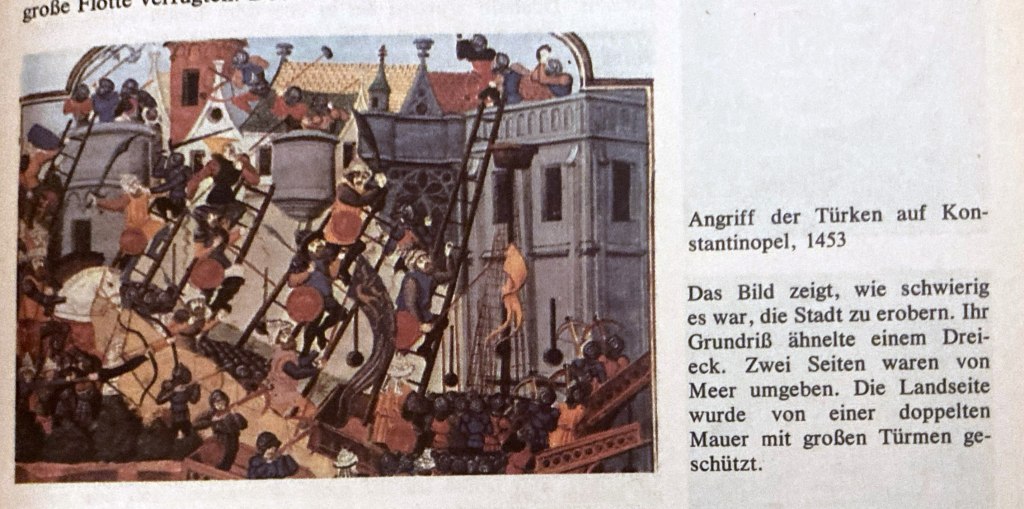 Das Bild zeigt, wie schwierig es war, die Stadt zu erobern. Ihr Grundriss ähnelte einem Dreieck. Zwei Seiten waren von Meer umgeben. Die Landseite wurde von einer doppelten Mauer mit großen Türmen geschützt.