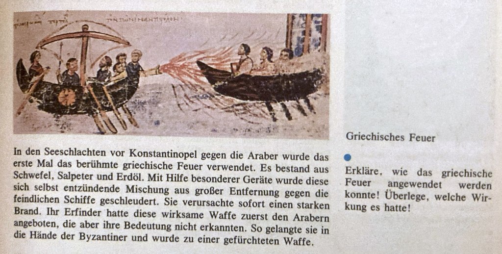 Erkläre, wie das griechische Feuer angewendet werden konnte! Überlege welche Wirkung es hatte!