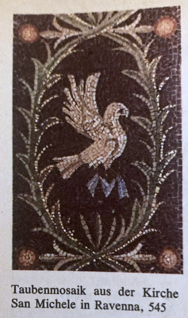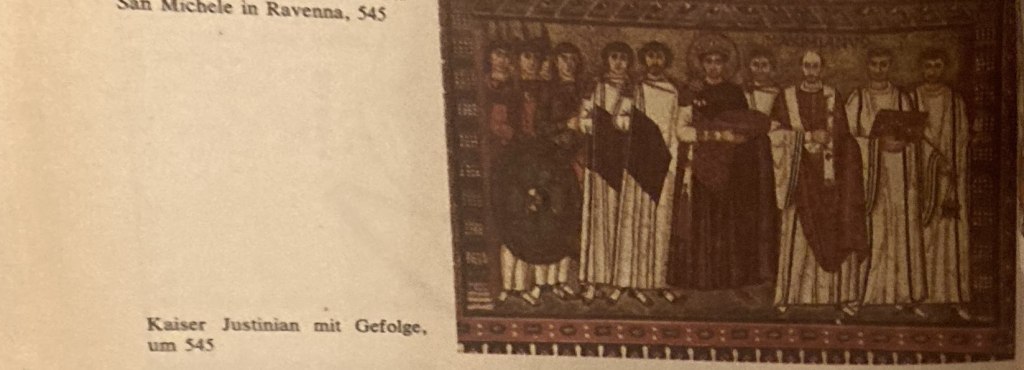 Das farbige Mosaik „Kaiser Justinian mit Gefolge“ stammt aus der Kirche San Vitale in der Stadt Ravenna, die nach der Wiedereroberung zum Mittelpunkt der byzantinischen Herrschaft in Italien wurde. Es zeigt den Kaiser Justinian mit seinem Gefolge bei einer kirchlichen Feier, rechts von ihm ein Bischof mit zwei Helfern, links von ihm und hinter ihm Hofbeamte und ganz außen seine Leibgarde. Auf dem Kopf trägt der Kaiser ein goldenes, edelsteinbesetztes Diadem mit Perlengehängen an den Ohren. Sein Seidenmantel ist purpurgefärbt ebenso wie seine Schuhe. Nur der Kaiser und seine Familie durften solche roten Schuhe tragen. Der Kopf des Kaisers ist von einem Heiligenschein umgeben, der seine Gottähnlichkeit zeigen soll. Die byzantinischen Kaiser verstanden es besser als die Herrscher des Westens, die christliche Kirche in den Dienst ihrer Politik zu stellen.